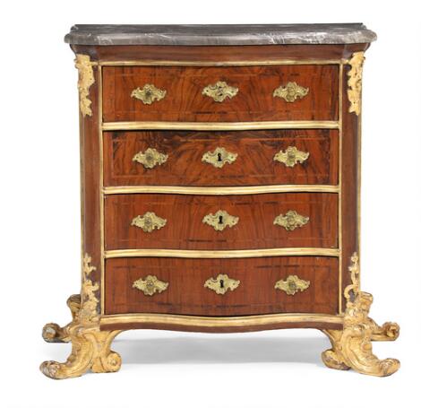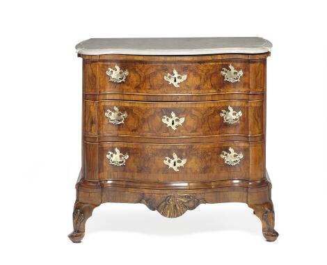 Nordtysk rokoko kommode af nøddetræ, nøgleskilte og greb af messing, profileret plade af grå marmor. 18. årh.s midte. H. 83. B. 89. D. 48.