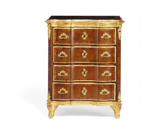 Dansk rokoko kommode af guldstafferet nøddetræ, front med fire svungne ligeknækkede skuffer. 18. årh.s midte. H. 83. B. 67. D. 40.