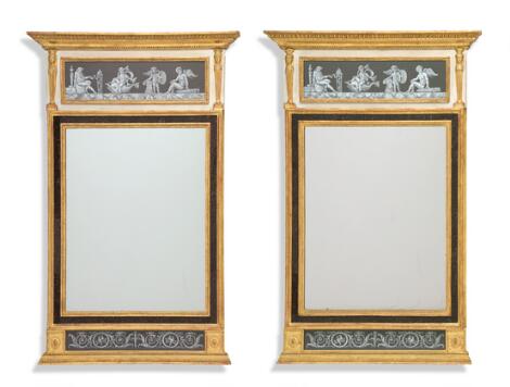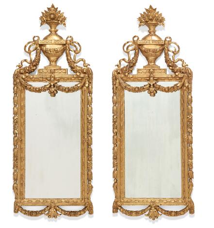 Johan Åkerblad: Et par sengustavianske spejle af forgyldt træ, begge stemplet på bagsiden med kronet IÅ. Stockholm. 18. årh.s slutning. H. 150 B. 77. (2