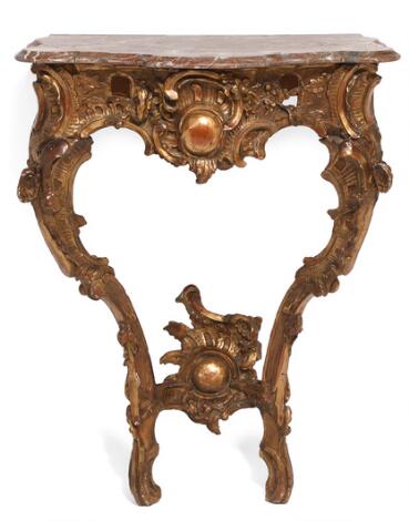 Dansk eller nordtysk rokoko konsol af forgyldt træ, senere plade af marmor. 18. årh.s midte. H. 86. B. 65. D. 40.