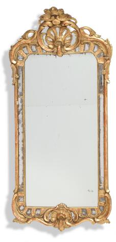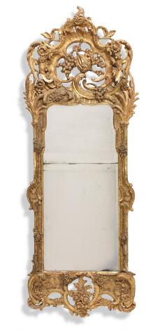 Stort dansk rokoko spejl i ramme af forgyldt træ og gesso, udskåret med gennembrudte blomster og bladværk. 18.årh.s midte. H. 172. B. 66.