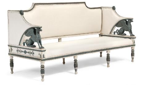Svensk sofa i Ephraim Ståhl stil af bemalet træ. Stockholm, 19. årh.s begyndelse. H. 113. B. 198. D. 75.