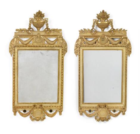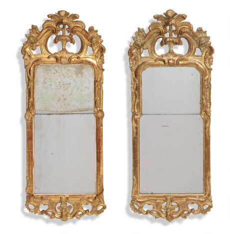 Et par næsten ens svenske transition, rokoko/gustaviansk, spejle af forgyldt træ. Stemplet 'SB'. 18. årh.s anden halvdel. H. 112. B. 43. (2)