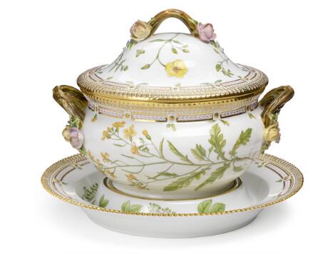 "Flora Danica" terrin med underfad af porcelæn, dekoreret i farver og guld med blomster. Royal Copenhagen.
