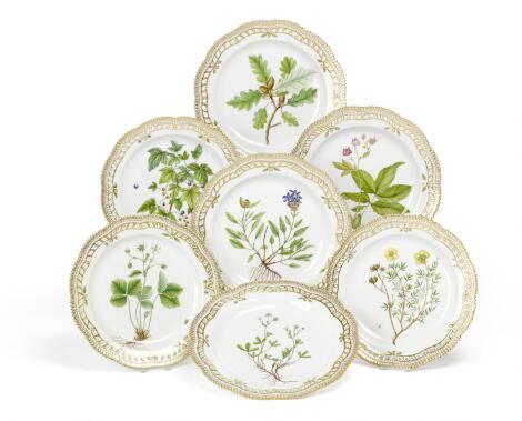 “Flora Danica” syv tallerkener af porcelæn med gennembrudt bort. 3574. Royal Copenhagen. Diam. 28,5 cm. (7)