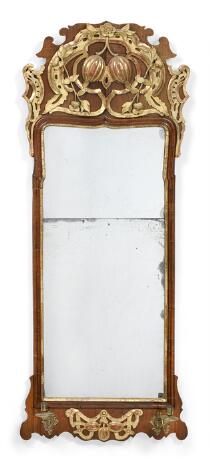 Dansk rokoko lampetspejl i ramme af guldstafferet nøddetræ, to senere lampetarme af bronze. 18. årh.s midte. H. 150. B. 60.