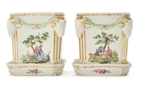 Et par cachepots af porcelæn med tilhørende underfade. Den Kongelig Porcelainsfabrik ca. 1780-85. H. 15,5 cm. (2)