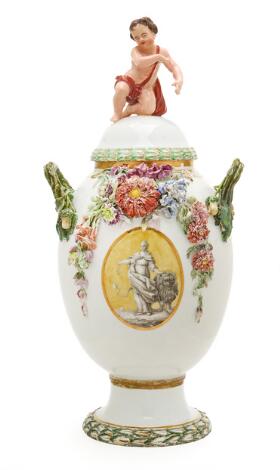 Potpourrivase med pousseringer, låg modelleret med putto. Den Kongelige Porcelainsfabrik ca. 1780-1785. H. 40 cm.