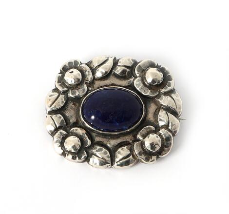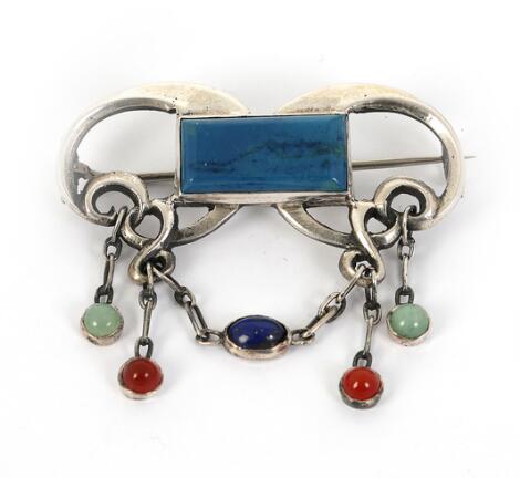 2546/1524M. Ballins Eftf.: Jaspisbroche af sølv prydet med jaspis, laspis lazuli, karneol og krysopras. Ca. 3,8 x 4,2 cm.