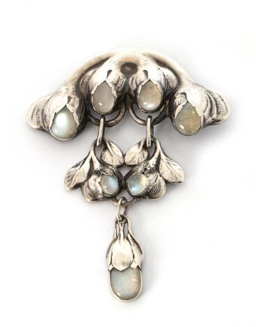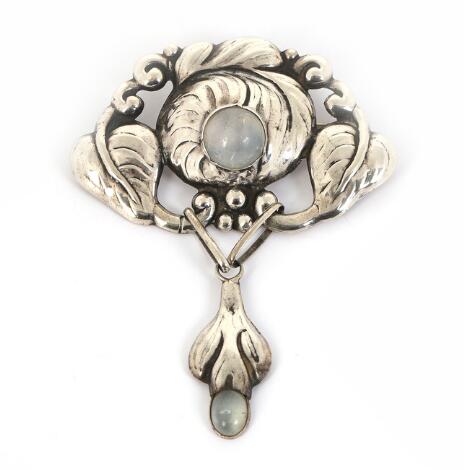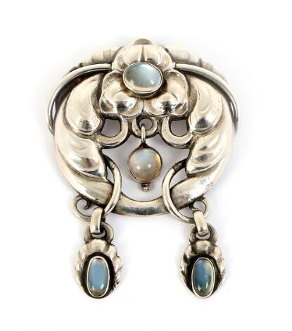 2546/1523Månestensbroche af sølv i form af stiliseret bladværk prydet med cabochonslebne månesten. Ca. 8,7 x 6,5 cm.