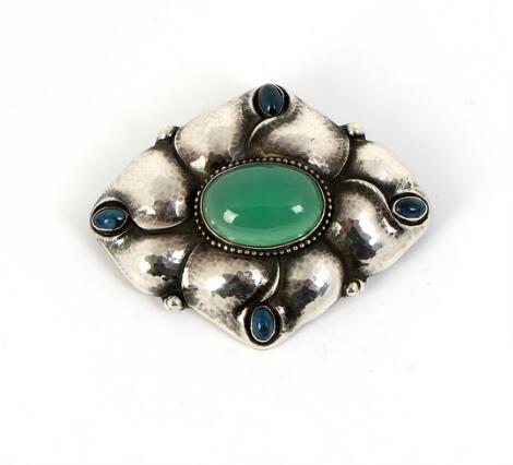 2546/1507A. Michelsen: Krysopras- og jaspisbroche af hammerslået sølv prydet med chrysopras og jaspis. Ca. 4,5 x 5,8 cm.