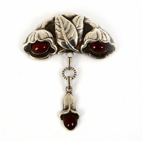 2546/1510Bernhard Hertz: Karneolbroche af sølv i form af blomster og blade prydet med cabochonslebet karneol. Ca. 8 x 6 cm.