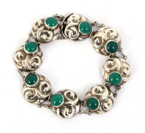 2546/1520C. V. C. Larsen: Armbånd af sølv med stiliseret ornamentik prydet ned cabochonslebet grøn plast. L. 19,5 cm.