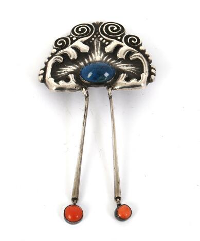 2546/1518M. Ballins Eftf.: Jaspis- og koralbroche af sølv prydet med cabochonslebet jaspis og koral. Ca. 8,5 x 4,5 cm.