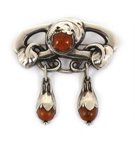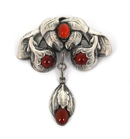 2546/1526Bernhard Hertz: Karneolbroche af sølv i form af bladværk prydet med cabochonslebet karneol. Ca. 9 x 7 cm.