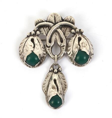 2546/1529Georg A. H. Halling: Broche af sølv i form af bladværk prydet med cabochonslebet grøn plast. Ca. 7,8 x 5,8 cm.