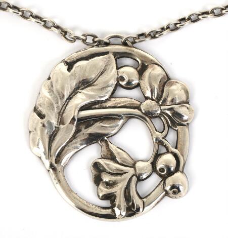 2546/1521Halskæde af sølv med vedhæng i form af bladværk. Vægt ca. 61 g. Vedhæng L. 6,8 cm. Kæde L. 72 cm.