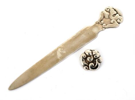 2546/1516Thorvald Bindesbøll: Brevåbner og broche af sølv prydet med stiliseret ornamentik. Udført hos Holger Kyster. (2)