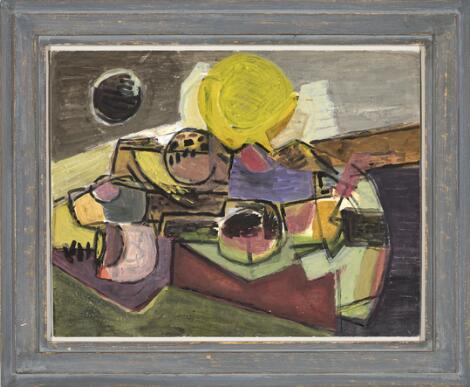 930/23LyngbyElsa Thoresen: Surrealistisk komposition, ca. 1947. Usigneret. Olie på masonit. 46 x 55 cm.