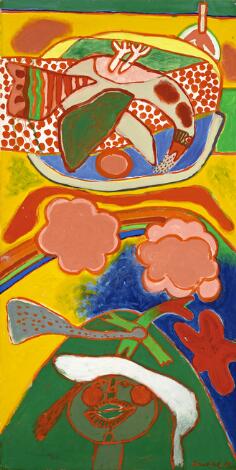 930/47LyngbyLucebert: "Father feather", 1961. Signeret Lucebert 5 VIII, '61; titel på bagsiden. Olie på lærred. 150 x 100 cm.