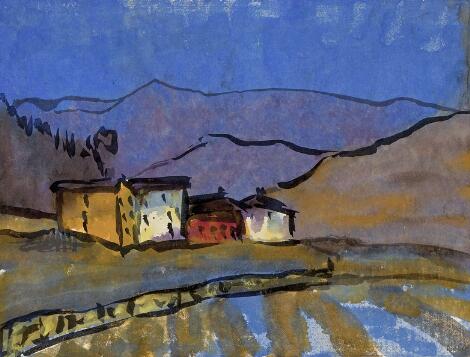 930/25LyngbyEmil Nolde: Schweizer Landschaft (Sils?), sidst 1920erne. Signeret Nolde. Akvarel på papir. Bladstørrelse 34 x 44.