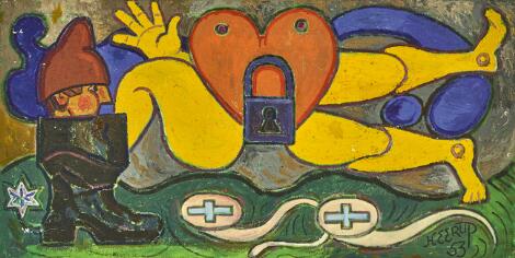 930/43LyngbyHenry Heerup: "Tabu", 1953. Signeret Heerup 53 samt signeret på blændrammen Heerup med titel. Olie på lærred. 70 x 138 cm.
