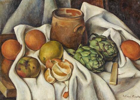 930/6LyngbyEllen Fischer: Nature morte med citrusfrugter og artiskokker, ca. 1920-25. Signeret Ellen Fischer. Olie på lærred. 38 x 54 cm.