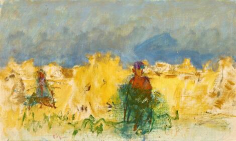 930/12LyngbyOluf Høst: Høstlandskab med figurer, Bornholm 1950. Dobbeltsigneret OH 50. Olie på lærred. 39 x 65 cm.