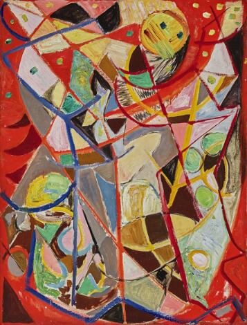 930/48LyngbyEgill Jacobsen: Komposition i rødt, Cagnes 1947. Signeret på bagsiden E.J. 47. Olie på lærred. 92 x 70 cm.