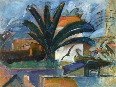 930/9LyngbyJens Adolf Jerichau: "Gorgettes store palme". Signeret Jens Adolf jerichau 1915 med dedikation. Olie på lærred. 46 x 61 cm.