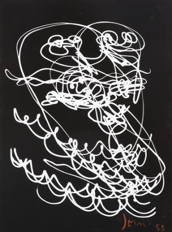 930/53LyngbyAsger Jorn: ”Divertimento”. Lystegning nr. 8, 1953/1970. Signeret Jorn 53. Fotogravure på lærred monteret på plade. 160 x 120 cm.