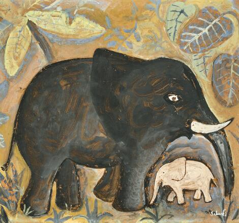 930/219LyngbyHans Scherfig: Elephant with calf. Signed Scherfig. Tempera on panel. 44.5 x 50.5 cm.