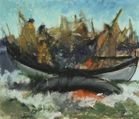 930/233LyngbyEdvard Weie: Shipyard, Christianshavn. Signed E.W. Oil on plywood. 47 x 51 cm.