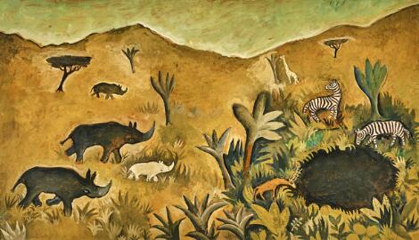 930/220LyngbyHans Scherfig: Savannah scene, 1939. Signed and dated on the reverse. Tempera on masonite. 70 x 123 cm.