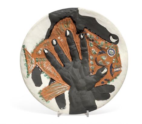 930/274LyngbyPablo Picasso: "Mains au poisson", 1953. Stamped Empreinte originale de Picasso. Madoura plein feu. 25/250. Dish. Earthenware. Diam. 30 cm.