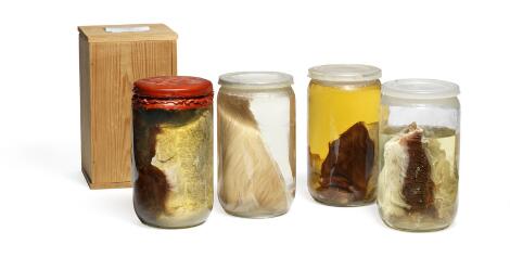 930/248LyngbyBjørn Nørgaard: "Hesteofringen" (The Horse Slaughtering), 1970. Four jars with preparations of the horse "Røde Fane" (Red Flag) in formaldehyde. H. 22 cm. (5)