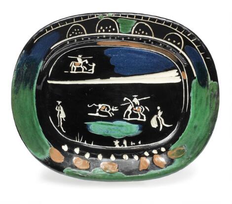 930/277LyngbyPablo Picasso: "Corrida verte", 1949. Stamped Madoura Plein Feu, Empreinte Originale de Picasso. Edition 500. Dish of faience. 30 x 36.5 cm.