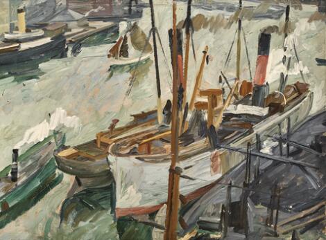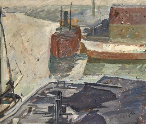 930/232LyngbyEdvard Weie: Ships at the quay, Christianshavn. Unsigned. Oil on canvas. 58 x 78 cm.