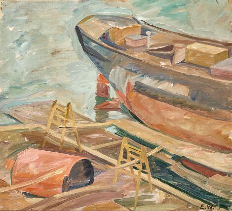 930/233LyngbyEdvard Weie: Shipyard, Christianshavn. Signed E.W. Oil on plywood. 47 x 51 cm.