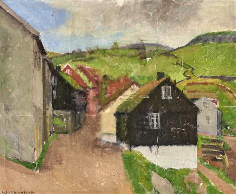 930/228LyngbySamuel Joensen-Mikines: Mykines village, The Faroe Islands 1957. Signed S.J. Mikines 57. Oil on canvas. 65 x 80 cm.