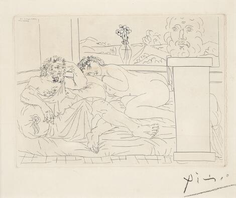 930/279LyngbyPablo Picasso: "Le repos du sculpteur, IV" (1933). Signed Picasso. Etching on Montval paper with Vollard watermark. Sheet size 34 x 45 cm.