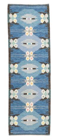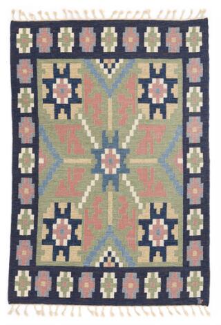 2603/540LyngbyIngegerd Silow: Handwoven wool carpet in “rölakan” flatweave technique. Geometric flower decor in shades of green, blue, red, grey and yellow.