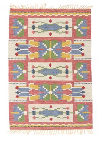 2603/543LyngbyErik Lundberg: Handwowen wool carpet in "rölakan" flatweave technique. Stylized flower pattern in shades of blue, pink, green, yellow and white.