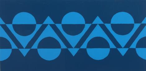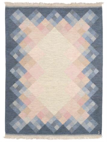 2603/549LyngbyBrita Svefors: Handwoven wool carpet in “rölakan” flatweave technique. Geometric composition in shades of blue and pink.