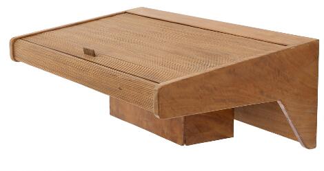 2603/525LyngbyNiels Vodder, attributed: Birch and mahogany wall mounted dressing table with tambour door on top.