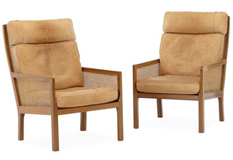 2603/552LyngbyBernt: A pair of high backed mahogany easy chairs. Cushions in seat and back upholstered with patinated natural leather. (2)