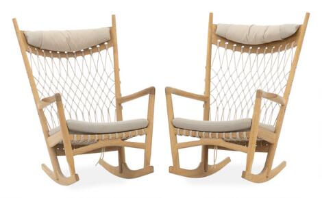 2603/555LyngbyHans J. Wegner: "PP 124". A pair of oak rocking chairs. Seat and back with flag halyard. Upholstered with beige coloured wool. (2)