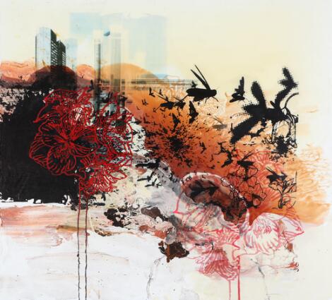 2603/524AarhusPaul Smulders: "Zonder titel", 2008. Signed on the reverse. Acrylic, oil and transfer print on canvas. 110 x 120 cm.