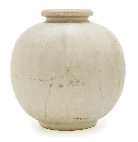 2603/510LyngbyArne Bang: A round stoneware vase decorated with greyish white glaze with few blue elements. H. 13 cm.