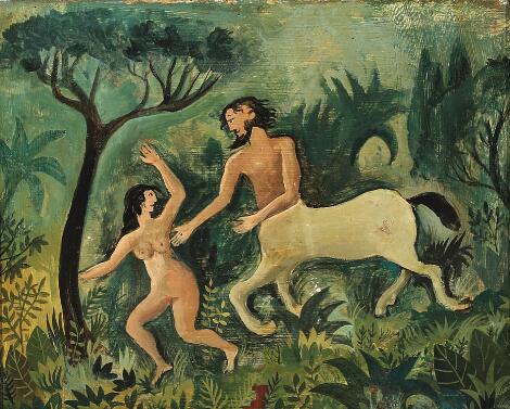 2603/553LyngbyHans Scherfig: Jungle motif with Deianeira and Nessos. Signed Scherfig. Tempera on masonite. 20 x 25 cm.